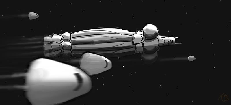 The Kin ships in the Plurality share a common architecture, with a ‘Spindle’, to which banana habitat modules are attached and attachment points for ‘Kataraa’ which provide the ‘Caravan Stack’ with thrust.