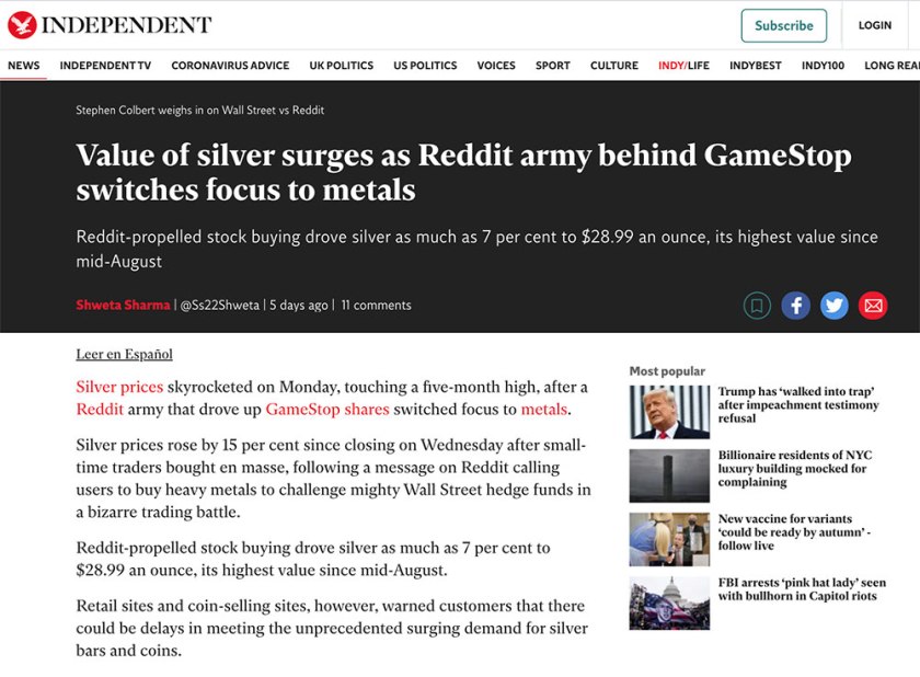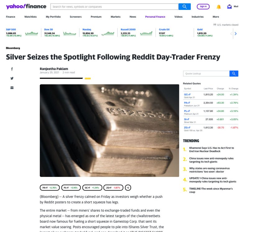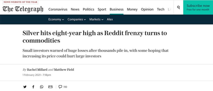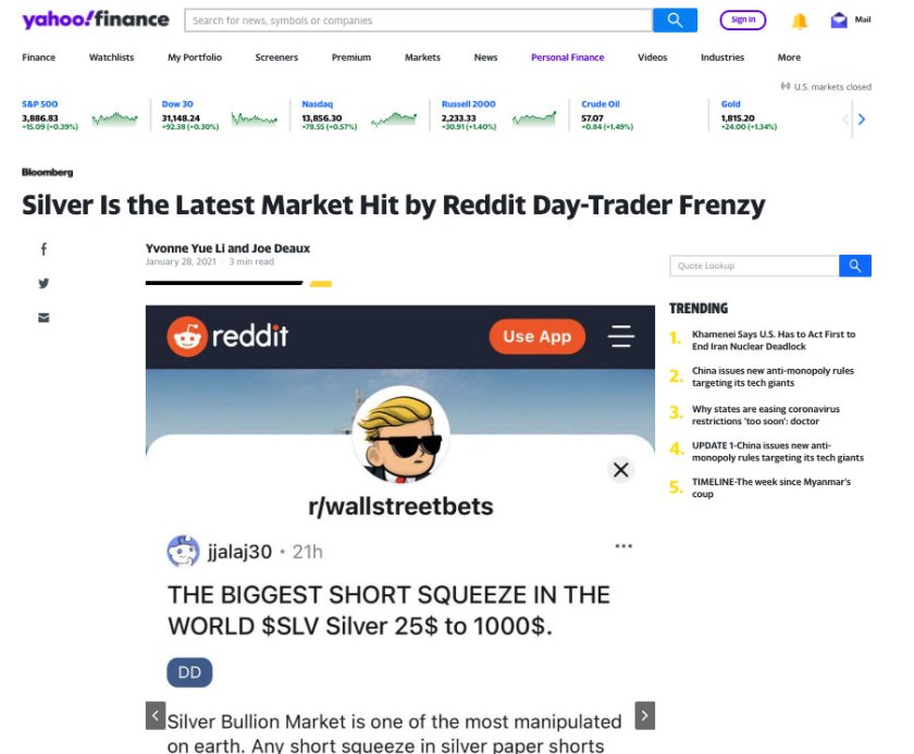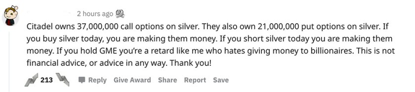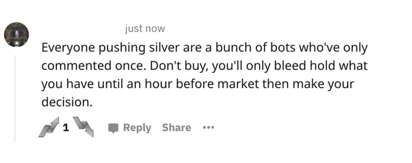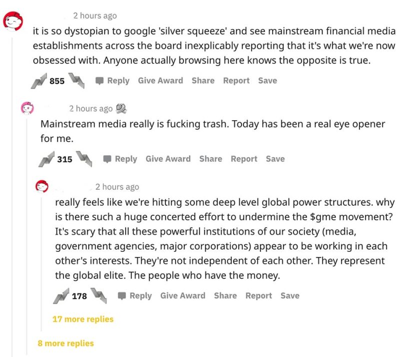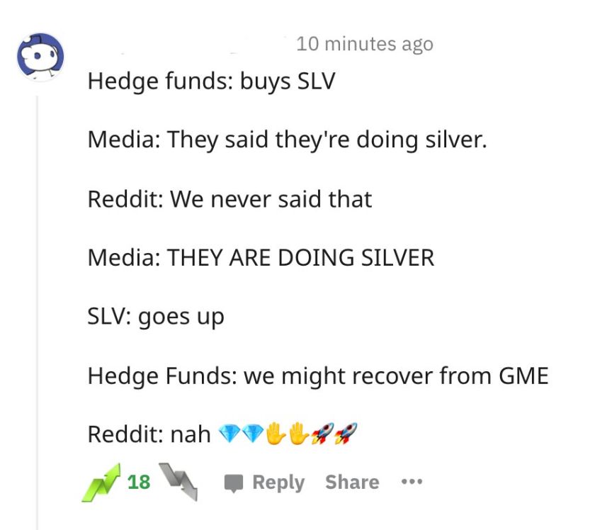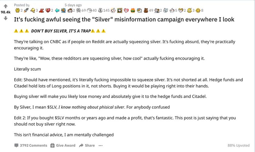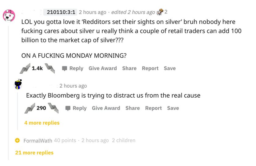 At the same time I was being spammed by these headlines coming from the MSM, I was browsing the r/wallstreetbets sub and discord. There was NOBODY saying buy silver… it was entirely manufactured. Reddit was well aware of this even as it was happening: