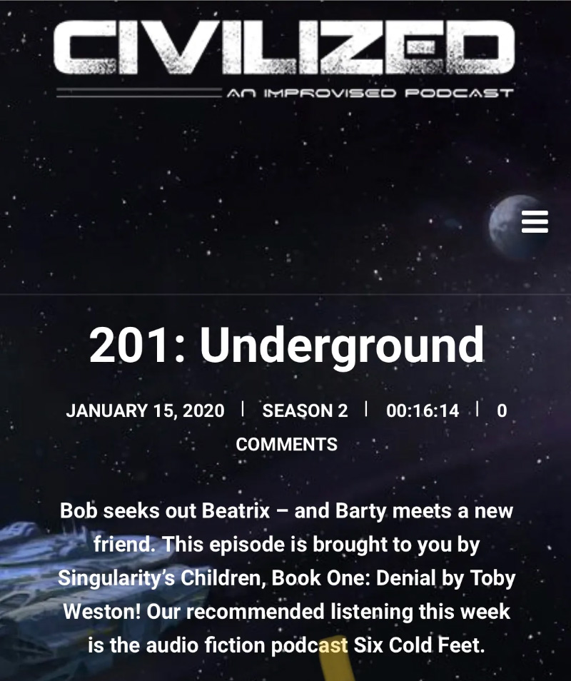 First up, the ‘Civilised Podcast‘. A really cool, improvised, episodic, dark comedy science fiction series which I’m sponsoring this week!