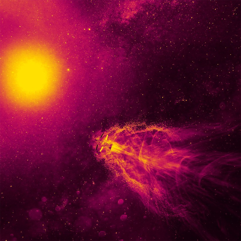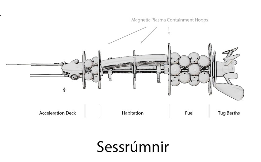 “Heatsinks accept entropy from the fusion chambers. Heat pumps push waste energy into the ship’s plasma shells, which are already inflating to enclose Sessrúmnir’s caravan stack in a many-layered spectral shroud. The plasma is held in equilibrium by magnetic flux squeezing against the fluid pressure of the heated plasma. Tiny confetti nano-motes dance within the plasma. They respond to Sessrúmnir’s magnetic coaxing, aligning into pseudo-crystals along curling field lines. As the plasma temperature climbs, Sessrúmnir orients the flakes, silver side in, dark face out, directing radiated heat away from the ship’s hull.”