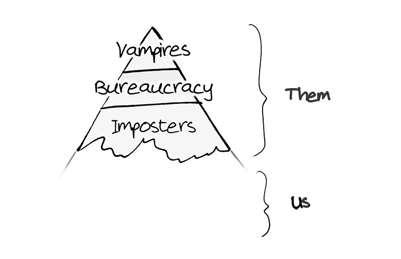 Vampires [I don’t mean literal night-walkers here. Vampire is just a powerful word that does a lot of heavy lifting. If you prefer, feel free to substitute with ‘psychopath’, or ‘predator’, or ‘power-hungry monster with an unslakable thirst for wealth’]. They are the apex of the pyramid. They are either unencumbered by morality or smart enough to think themselves convenient detours around such inconvenient instincts. They would prefer not to care about the destruction of the world, but they do wonder—after it has all fallen into mad-max ruin — who will make their lattes, mow their lawns, paint their art, and suffer in their dungeons.